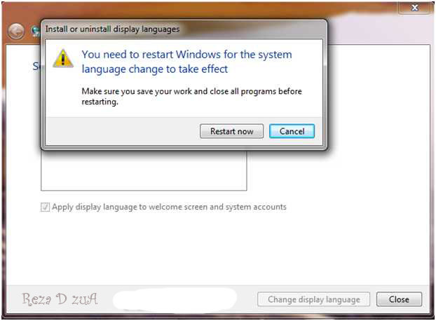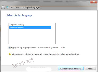 Pilih bahasa Indonesia kemudian beri tanda ceklis pada Apply display languange to welcome screen and system accounts. Selanjutnya tekan tombol Change display language.